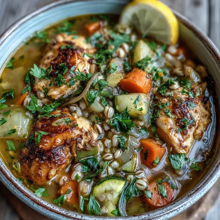 Sometimes I skip the chicken entirely and add chickpeas instead, letting them simmer until they are creamy and soft. The barley provides enough substance that nobody misses the meat, and the chickpeas absorb all those beautiful spices.